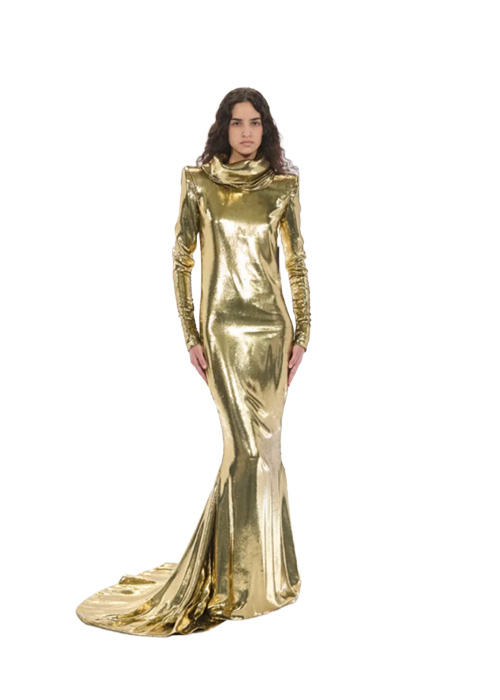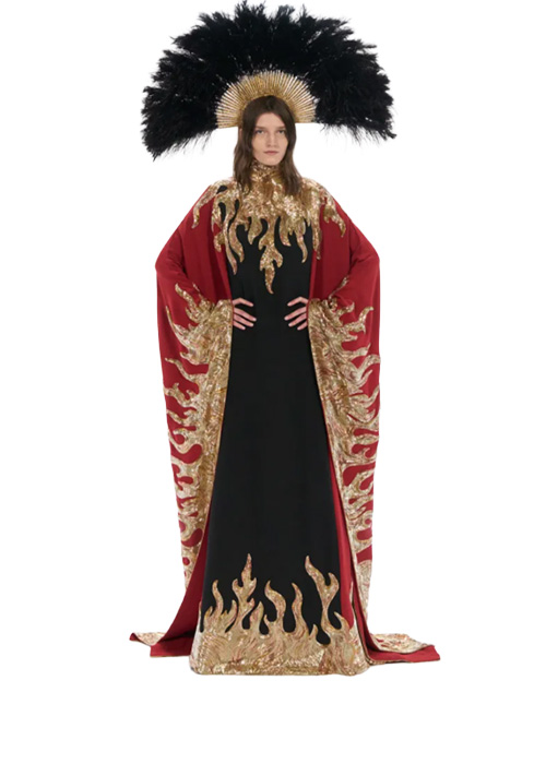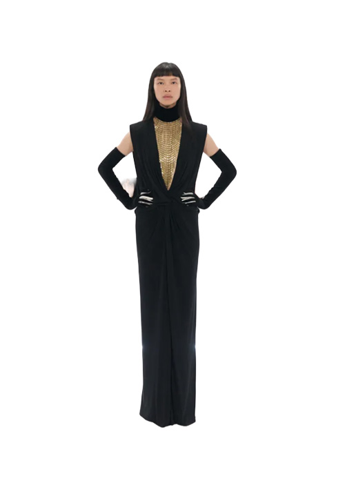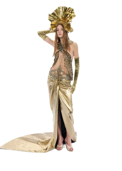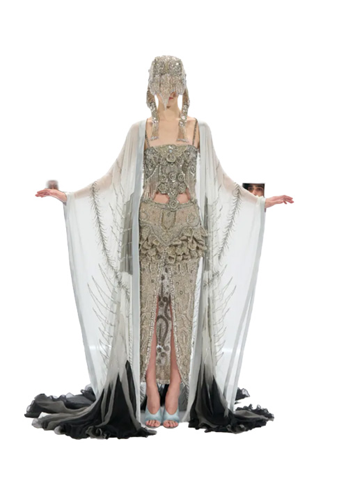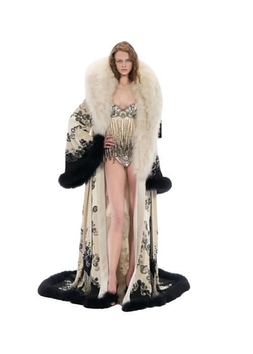 Within this dispositif, the figure of the media bimbo, omnipresent in the contemporary fashion ecosystem, is implicitly summoned only to be neutralized. The gaze is no longer predatory, distracted, or collective. It is forced into attention. Into patience. Into responsibility. Some silhouettes seemed to have escaped from the graphic reveries of Erté: a white satin slip dress, cut on the bias, brushed by an embroidered ivory velvet coat whose airy train transformed into a sumptuous headdress of ostrich feathers studded with rhinestones. Others summoned the imaginary world of the Ziegfeld Follies or the bewitching shadow of Mata Hari, poised between theater, vertigo, and splendor.