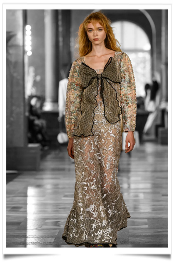 This collection was born from a secret oath between the splendor of yesterday and the vigor of today (says the designer). From the magnificence of the French court, she borrowed grandeur, brocades, solemn braids, and radiant crosses; but instead of letting them slumber in the dust of palaces, she set them against the wild momentum of our century, so that they might clash and fertilize one another in a dazzling embrace.