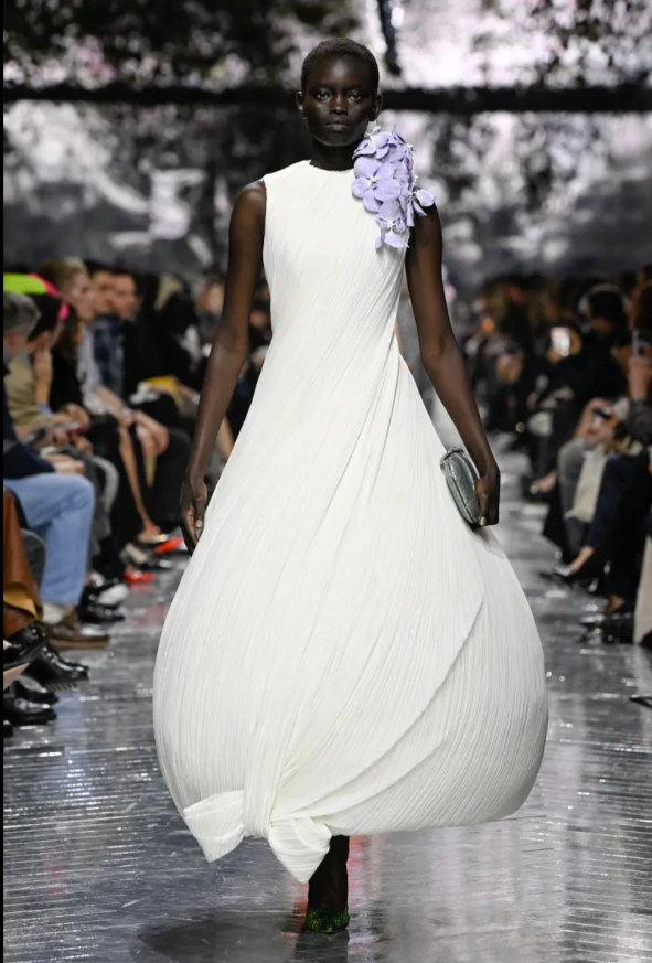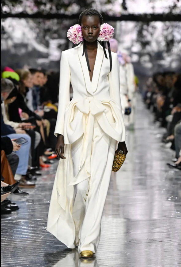 This is precisely the language Roseberry seems to have learned by heart. Haute couture, in his hands, is not a caress but a defensive strategy. The woman he dresses does not drift, she bristles in a shell dress, a white armor of duchesse satin. She knows how to protect herself.