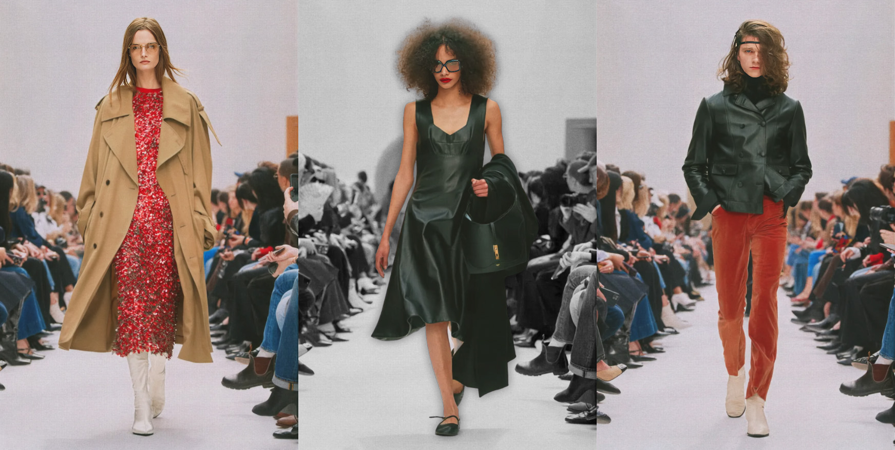 Bowler hats brush shoulders with ostentatious bucket hats. Supple sneakers fraternize with small-heeled ankle boots. And everywhere, much darkness. Black, night, coal, dusk. A solemn palette for a future that seems, how shall we put it… elegantly anxious.