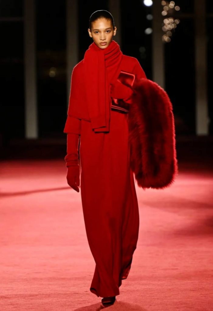 Daytime was adorned with sumptuous jeans, straight and noble in their simplicity, blending cashmere with cotton. Coats rose like portable architectures, with their theatrical collars, their masterful pea coats, their fur stoles, their smooth leather gloves, their sculptural accessories that lent knitwear the dignity of an edifice.