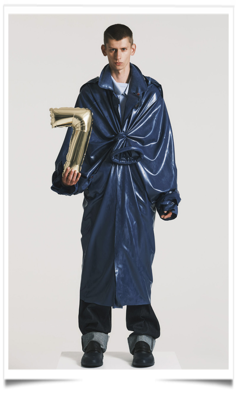 The big winner was proudly announced: Lucas Emilio Brunner, a Swiss-Chilean apostle of the balloon, messiah of inflatable materials, graduate of “The Arch of the Back,” and convert to the Margiela liturgy. His vision for the future of clothing? Balloon knots on trench coats moving from animal bladders and intestines to squeaky polymers. A show that sounded like a fanfare for sad clowns.