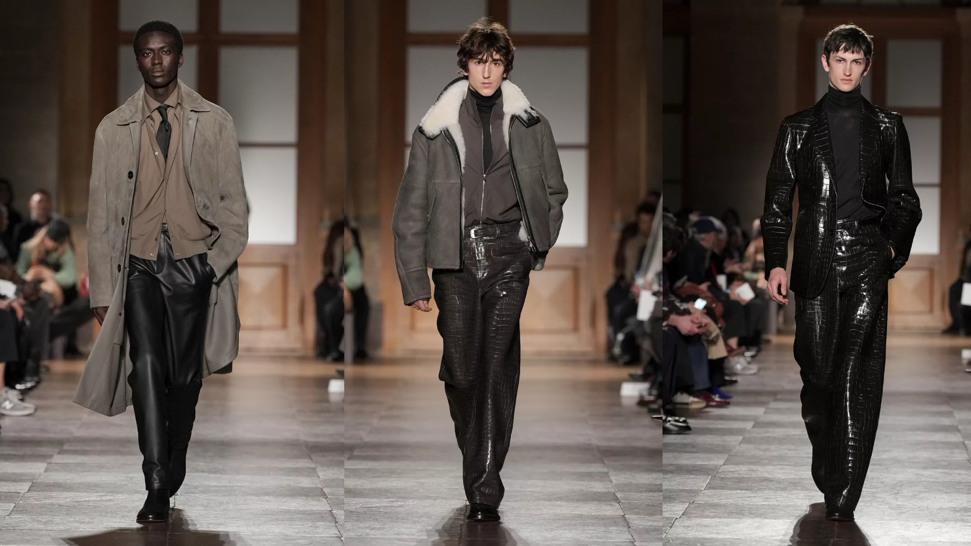 Outside, on the Place de la Bourse, the crowd chants another name, that of Travis Scott, the sole rap infused contribution to the Hermès fashion narrative, voices hurled into the modern night shaped by the vision of LV. Inside, however, it is Véronique Nichanian’s name that circulates, discreet yet persistent, like an ancient breath threading its way through every conversation. One need only raise one’s eyes to the ceilings to feel the vertigo of a chapter drawing to a close. Later, when the final silhouette has crossed this last runway, the suspended screens will descend slowly, like curtains of memory, restoring yesterday’s salutations. But for now, the artistic director still gathers one final breath and offers it to the Hermès man she has shaped.