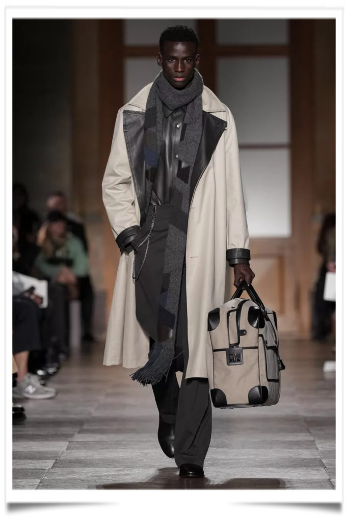 Outside, on the Place de la Bourse, the crowd chants another name, that of Travis Scott, the sole rap infused contribution to the Hermès fashion narrative, voices hurled into the modern night shaped by the vision of LV. Inside, however, it is Véronique Nichanian’s name that circulates, discreet yet persistent, like an ancient breath threading its way through every conversation. One need only raise one’s eyes to the ceilings to feel the vertigo of a chapter drawing to a close. Later, when the final silhouette has crossed this last runway, the suspended screens will descend slowly, like curtains of memory, restoring yesterday’s salutations. But for now, the artistic director still gathers one final breath and offers it to the Hermès man she has shaped.