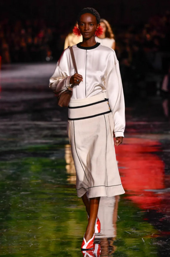 The first sign emerged in a plaid wool pantsuit without a jacket a discreet tribute to Gabrielle, the woman who once borrowed Arthur Capel’s clothes to invent freedom. Shirts, crafted by Charvet, lengthened or shortened, wrinkled with desire and elegance, conversing with abyssal black skirts and scarlet dresses trimmed with breathing feathers.