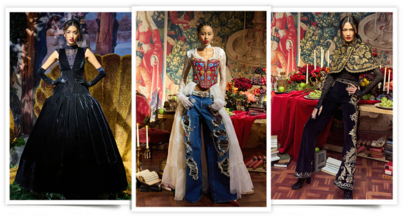 This collection was born from a secret oath between the splendor of yesterday and the vigor of today (says the designer). From the magnificence of the French court, she borrowed grandeur, brocades, solemn braids, and radiant crosses; but instead of letting them slumber in the dust of palaces, she set them against the wild momentum of our century, so that they might clash and fertilize one another in a dazzling embrace.