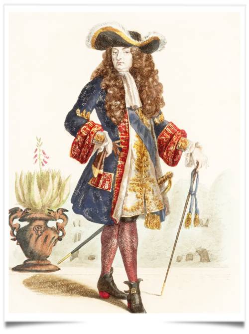 Under Louis XIV, the stocking (or long “sock,” but made of silk!) was not a mere accessory: it was a symbol of nobility and refinement, on par with the wig, the lace jabot, or the red heels. The stockings were made of fine silk, often imported from Italy or from Lyon, the great capital of French silk-making. They were sometimes knitted by hand, sometimes by machine, since the knitting machine (invented by William Lee at the end of the 16th century) had already begun to spread.