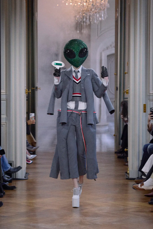 But let’s not be cynical: Hector now has his own mythology. This season, the pooch reigns proudly among interchangeable bermuda shorts because you have to keep reinventing the idea of the “new bag” when you keep selling the same thing. And since Thom Browne never does things halfway, the faithful companion even shows up embroidered into tweed intarsia and Mogador silk. You can almost picture the dog yawning in boredom amid so much seriousness.