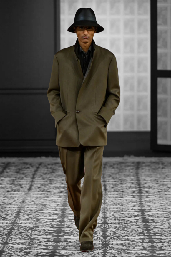 The models emerged from the dressing room as one steps out of a mental wardrobe, the place where lived seasons are stacked one upon another. Beneath their feet, the floor became a patchwork, strewn with rugs of uneven sizes, varied motifs and styles, mirroring those memories that never quite arrange themselves into order. The bodies, young or mature, drawn from diverse geographies, and at times even female, formed a long, nuanced sentence, in which each silhouette added a new inflection to Sartori’s discourse. There was nothing uniform here. Everything belonged to a subtle harmony.