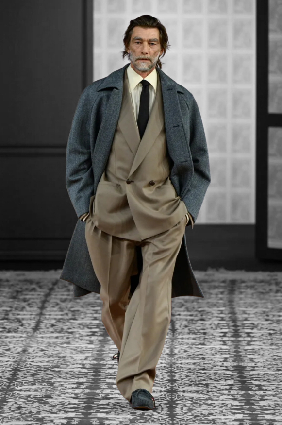 For Sartori, the irreproachable quality of his work is not an austere dogma. It resembles instead an intimate, almost domestic ethic, one that urges repair rather than disposal, adjustment rather than replacement. The classics of the Zegna wardrobe are not quoted as relics, but reread, shifted, gently corrected by the present. Thus the Conte jacket, a tutelary figure, gained a few centimeters in length, lowered its pockets and buttons, as though time itself had taught it a form of ease. It nonetheless retained its structure, its proudly pointed high lapels, and suggested the air of an aristocrat who has learned to walk barefoot in the garden.